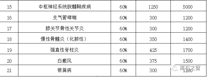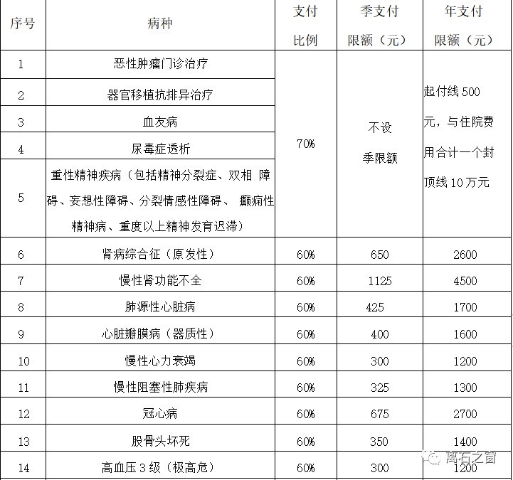 特殊门诊慢性病(5种):肾功能不全血液(或腹膜)门诊透析治疗、恶性肿瘤门诊放疗(或化疗)、血友病门诊凝血因子治疗、慢性髓性白血病(或慢性淋巴细胞白血病、儿童急性淋巴细胞白血病)及器官(含肾、肝、肺)移植术后口服抗排异门诊用药。在经城乡居民按规定支付后,仍需个人负担的合规费用,由城乡居民大病保险按报销比例支付,不设起付线。