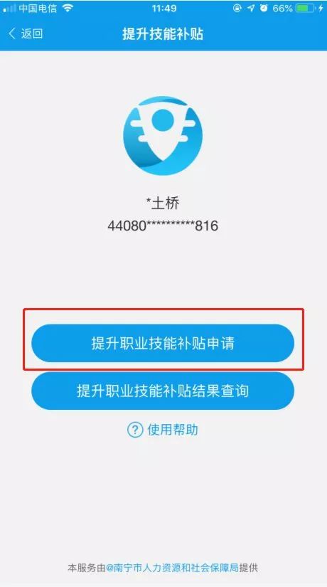 3、选择“提升技能补贴申请”按钮,进行实人认证。