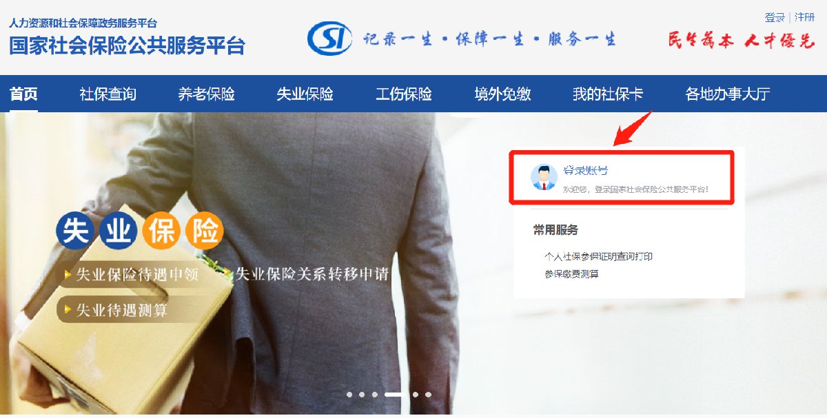 第一步:在国家社会保险公共服务平台首页,找到【登录账号】,实名认证登录国家社会保险公共服务平台,如下图所示: