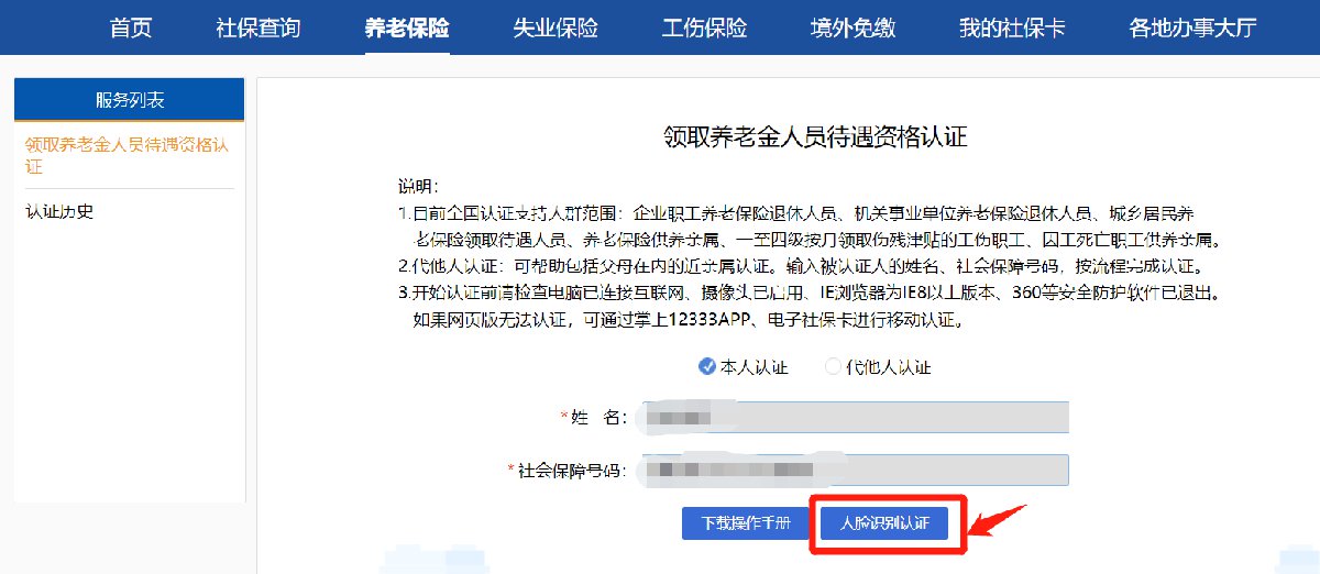 第三步:在【领取养老金人员待遇资格认证】页面中,点击【人脸识别认证】,如下图所示:
