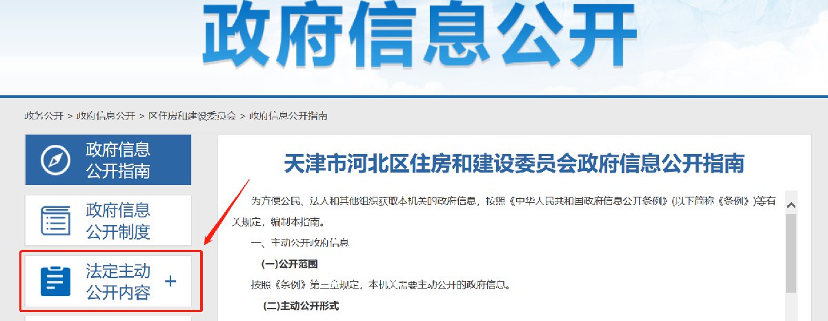 1、进入“天津市河北区住房和建设委员会”官网,点击左侧“法定主动公开内容”;