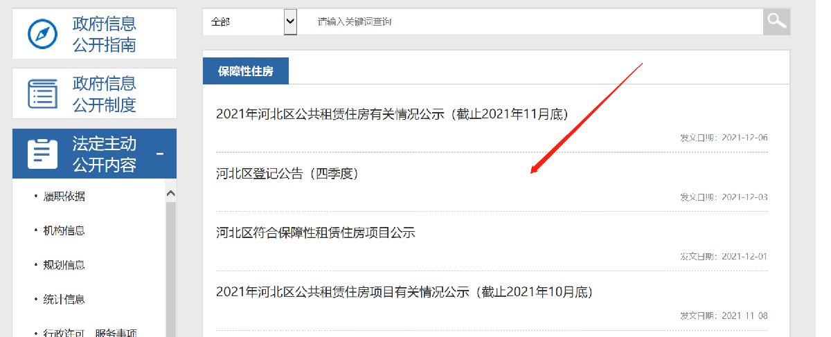 3、打开后找到“保障性住房”,查找公租房申请公告,公告内包含河北区公租房登记、摇号、房源等信息;