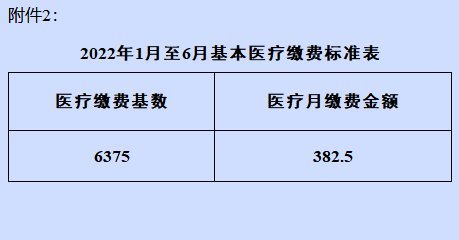 2022年1-6月灵活就业人员基本医疗保险费缴费基数6375元/月。(具体标准见附表)