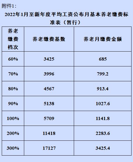 在2021年全省全口径平均工资公布前,暂按2020年全省全口径平均工资确定养老保险费缴费标准,选择60%、70%、80%、90%、100%、200%、300%档次的,按3425、3996、4567、5138、5709、11418、17127元/月七个缴费基数标准进行缴费。其中,2021年已选择3284元/月最低缴费档次的,2022年1月统一调整为3425元/月,首次缴费前可自主选择缴费档次。待2021年全省全口径平均工资公布后,七个档次的养老保险费缴费标准同步调整,并对1月至缴费标准调整月差额部分进行补缴,有关工作事项请关注后续通知。(具体标准见附表)