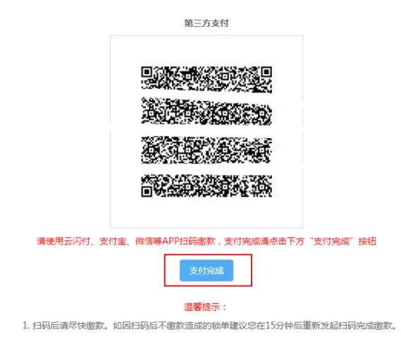 系统弹出第三方支付的二维码,纳税人应使用云闪付、支付宝、微信等APP扫码缴款,支付完成请点击下方“支付完成”按钮