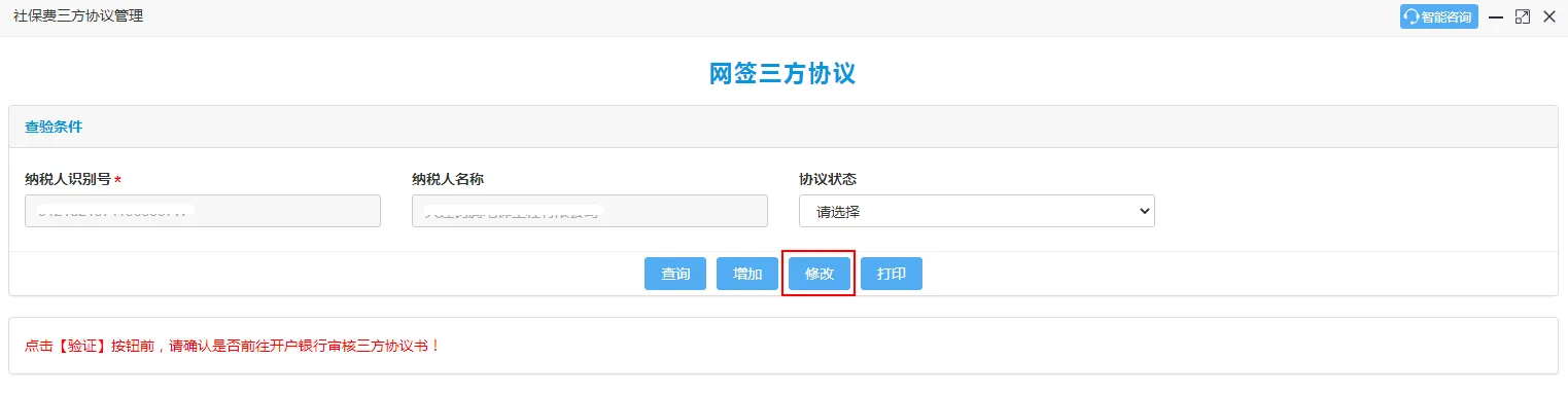 1、在社保费三方协议管理功能中可实现缴费单位在线查询、新增、修改的功能。