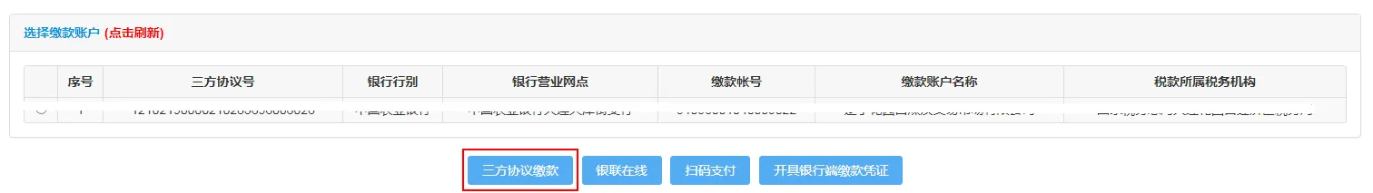 在【未缴款信息】模块选择纳税人需要缴款的明细行次后选择【缴款账户】点击【三方协议缴款】按钮。