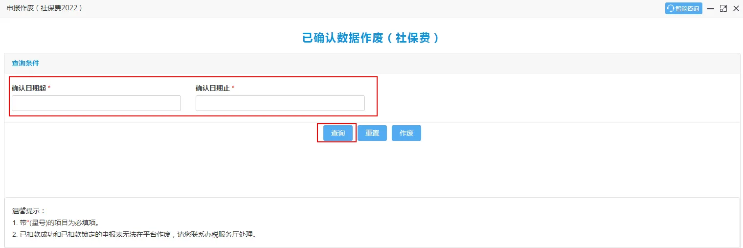 2、进入申报作废(社保费)中选择【所属期起】与【所属期止】及申报表种类后点击【查询】按钮。