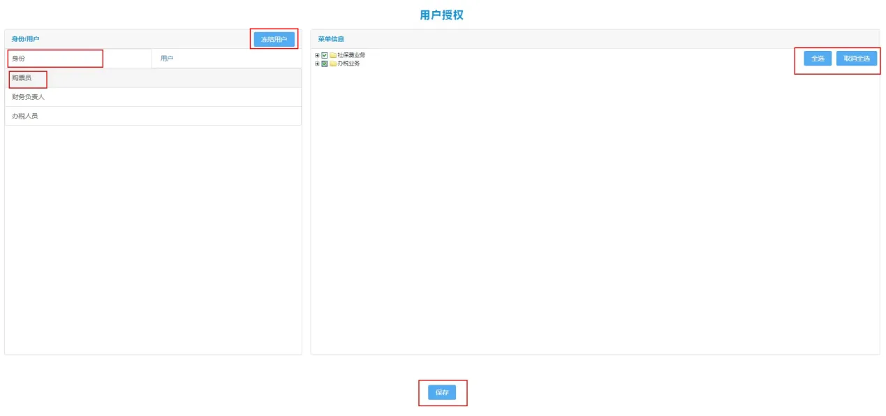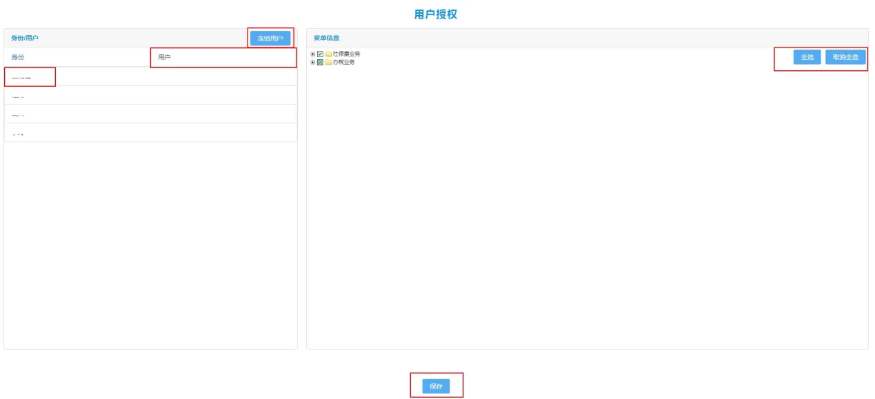 进入用户授权功能点击左侧【身份】栏次,系统自动带出本企业实名人员的身份信息,可下拉选中后可进行权限的分配,可点击功能左上角的【全选】或【取消全选】按钮进行操作,确认无误后点击【保存】按钮。