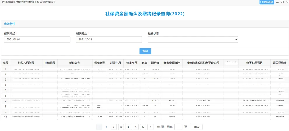 4、页面自动带出:纳税人识别号、社保编号、单位名称、缴费类型、起始年月、终止年月、利息、滞纳金、税费金额合计、社保数据发送税务平台时间、税票号码、是否已缴费。