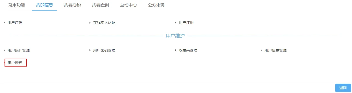 用人单位的法人及财务负责人可通过“用户授权”功能对单位不同角色人员登录电子税务局的功能菜单权限进行调整,可通过【我的信息】-【纳税人信息】-【用户管理】-【用户授权】进入用户授权功能。