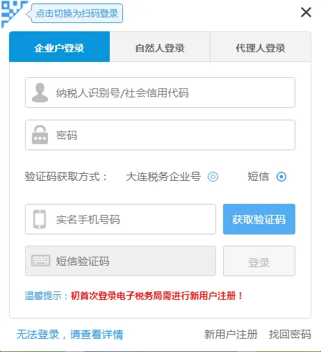 首次使用电子税务局的用人单位,需要先使用实名手机号进行新用户注册。实名相关操作可通过微信“【大连税务企业号】-【实名认证】”功能办理。