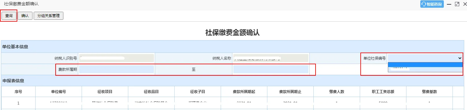 2、纳税人可点击【查询】“费款所属期”与“单位社保编号”筛选出纳税人所需要确认的社会保险费并对其进行确认。