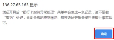 系统提示:“凭证开具后“银行卡缴纳异常处理”菜单中会生成一条记录,请不要做“撤销”处理,否则会影响税款缴纳,携带凭证等相关资料去银行缴款即可。”