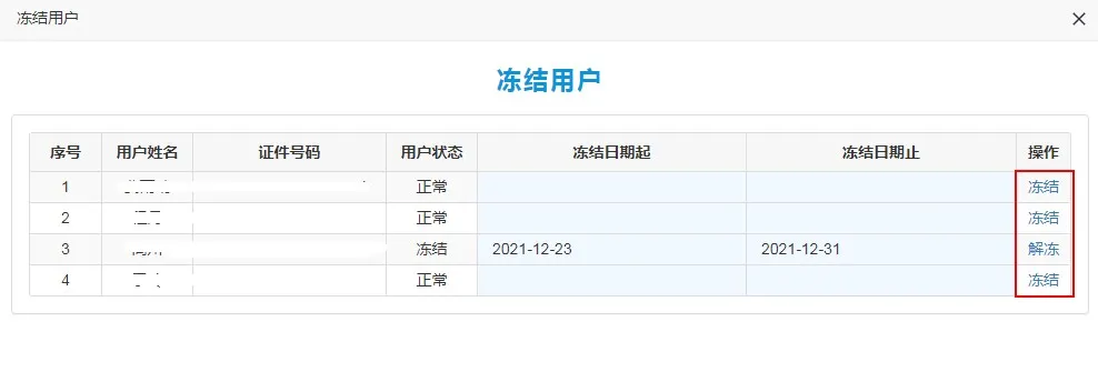 通过“身份用户”右侧的【冻结用户】按钮,可进入“冻结用户”界面,页面展示企业实名绑定的人员信息。在想要冻结的用户上填写冻结日期起/止后,在页面右侧的操作列点击【冻结】按钮,此时“用户状态”变为冻结,被冻结的用户无法登录电子税务局。