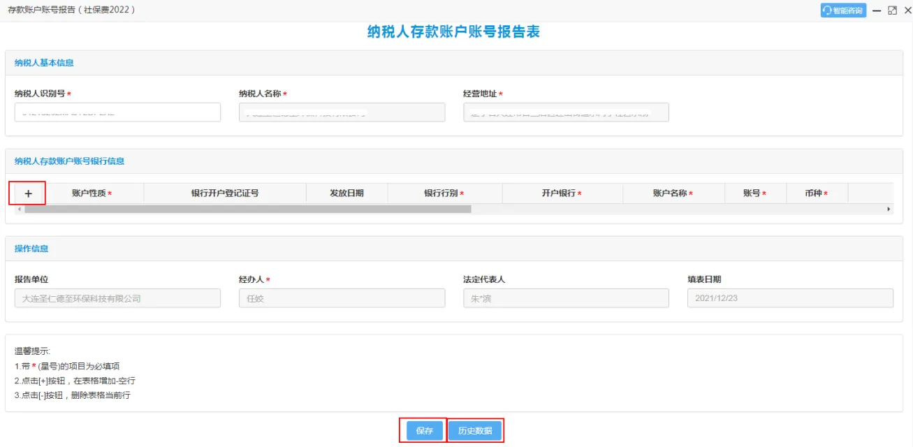若企业未进行存款账户账号报告,则无法使用【开具银行端缴款凭证】缴款,因此需要企业通过“存款账户账号报告(社保费2022)”功能进行新增银行账户。点击“+”按钮进行增行,填写无误后,点击【保存】按钮。