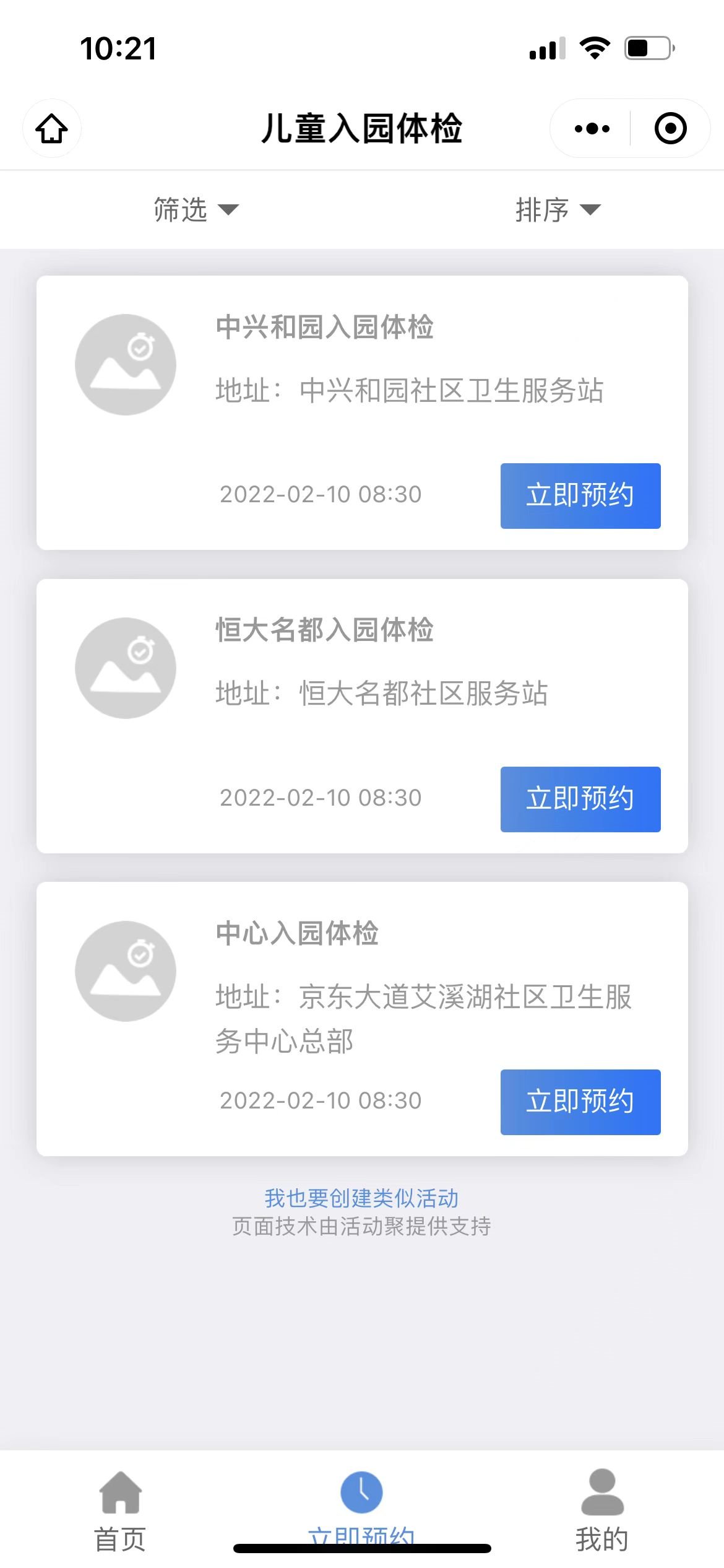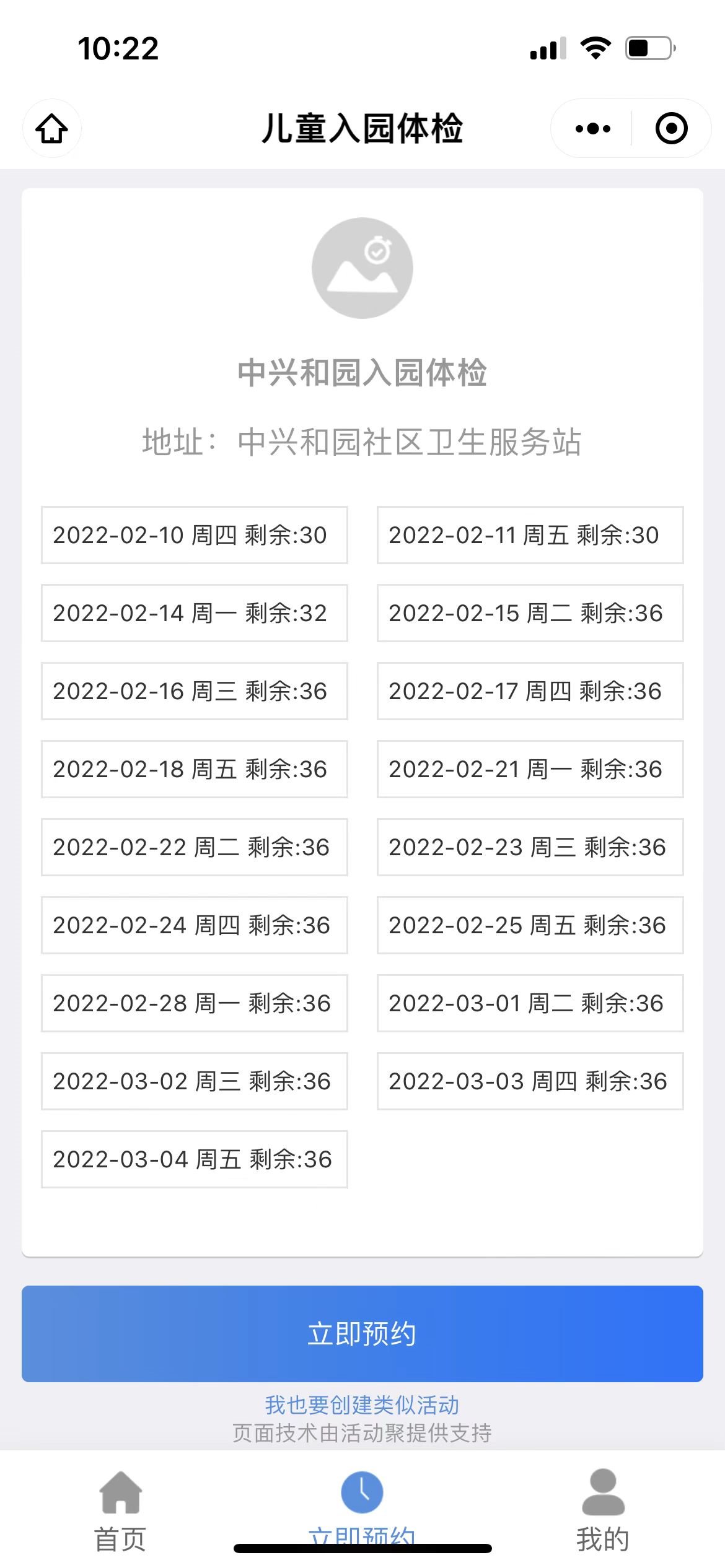 第二步:进入首页儿童入园体检,点击下方立即预约,选择体检地点。
