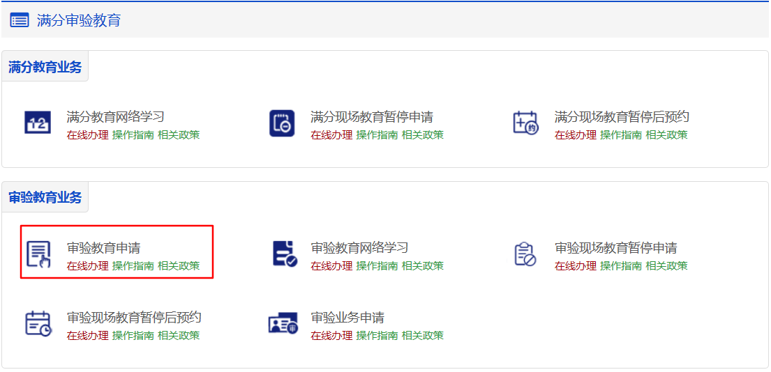 用户通过该功能可以申请网络教育或现场教育方式来完成审验教育。