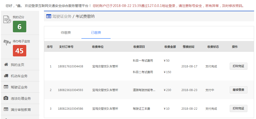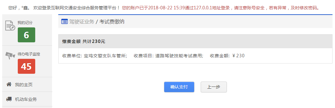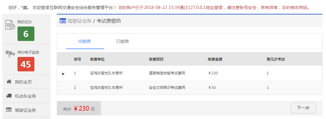 用户在互联网登录后,点击【驾驶证业务】→【考试费缴纳】业务功能办理。
