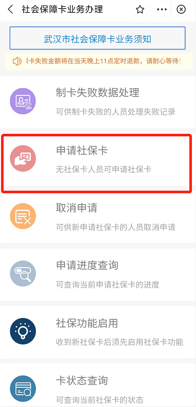 2、线上申领社保卡制卡周期为29个工作日,申请成功后无法取消,申请请慎重。如急需用卡,请勿线上申请,可到社保卡合作银行代办网点即时办理。