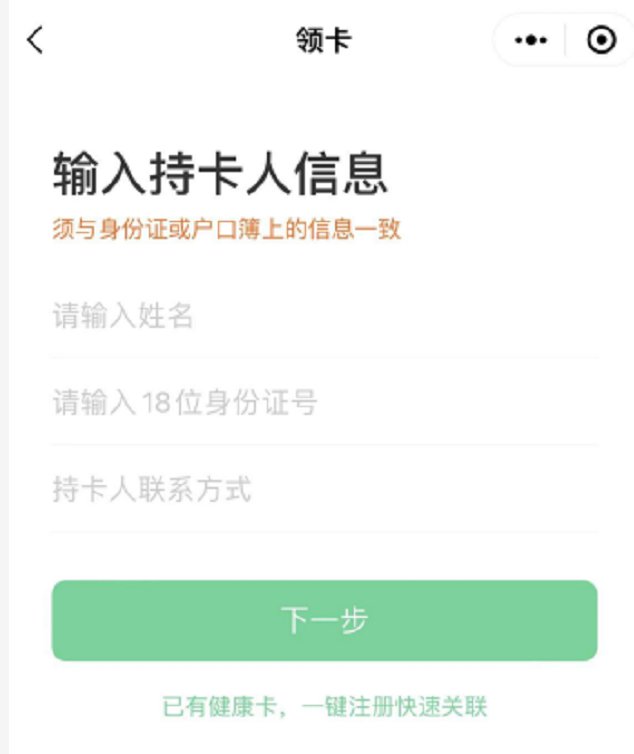 点击【+添加电子健康卡】按钮,进入领卡页面,如下图: 输入领卡人真实的姓名/身份证号/手机号,点击【下一步】: