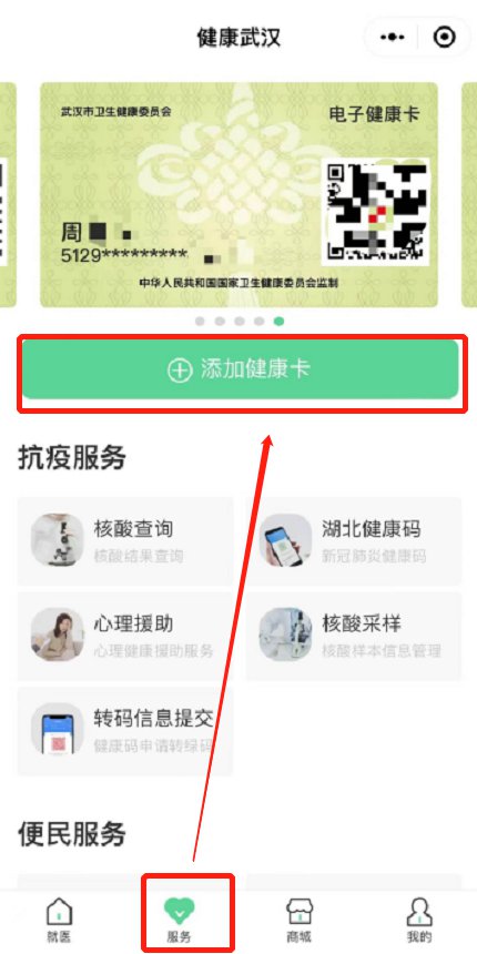 进入健康武汉小程序,点击底部【服务】菜单,在页面顶部找到【+添加健康卡】按钮,如下图:
