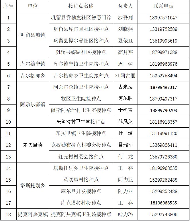 巩留县2022年脊髓灰质炎接种点一览表