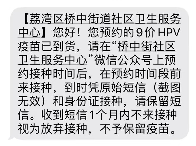 如果登记预约成功了荔湾区桥中街社区卫生服务中心九价HPV疫苗,会收到预约短信,如下图,再预约具体的接种时间。