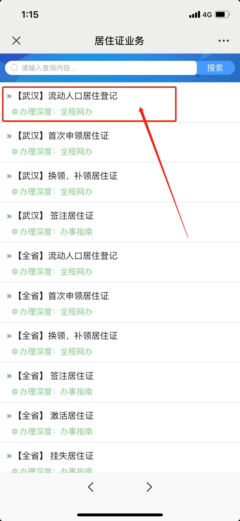 步骤三:选择“【武汉】流动人口居住登记”,或者“【全省】流动人口居住登记”;