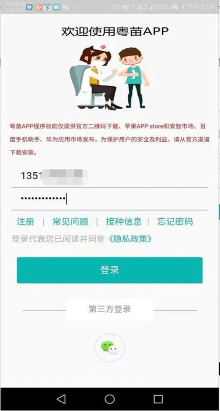 第二步:打开粤苗APP,可以通过绑定微信的方式直接登录;也可以注册账号,注册完成后,用注册的账号密码登录即可,操作流程如下图所示: