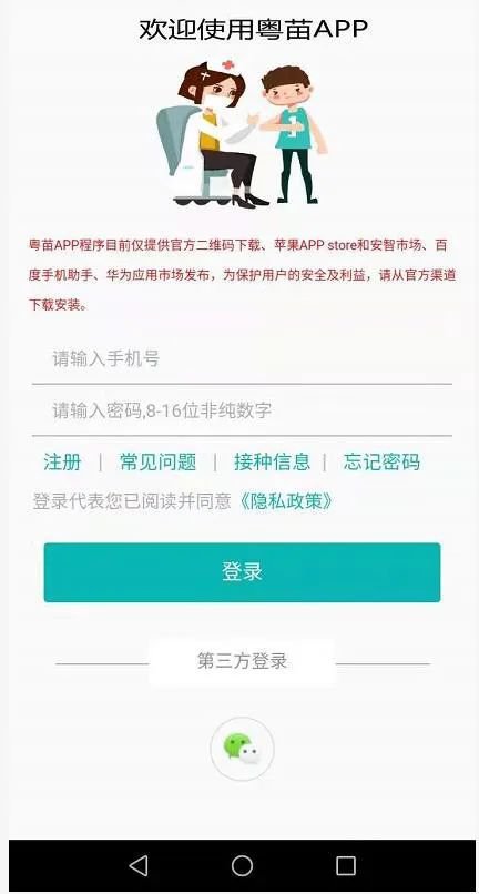 第一步:用户可通过扫描二维码下载粤苗APP安装到手机(Android版,苹果版)。