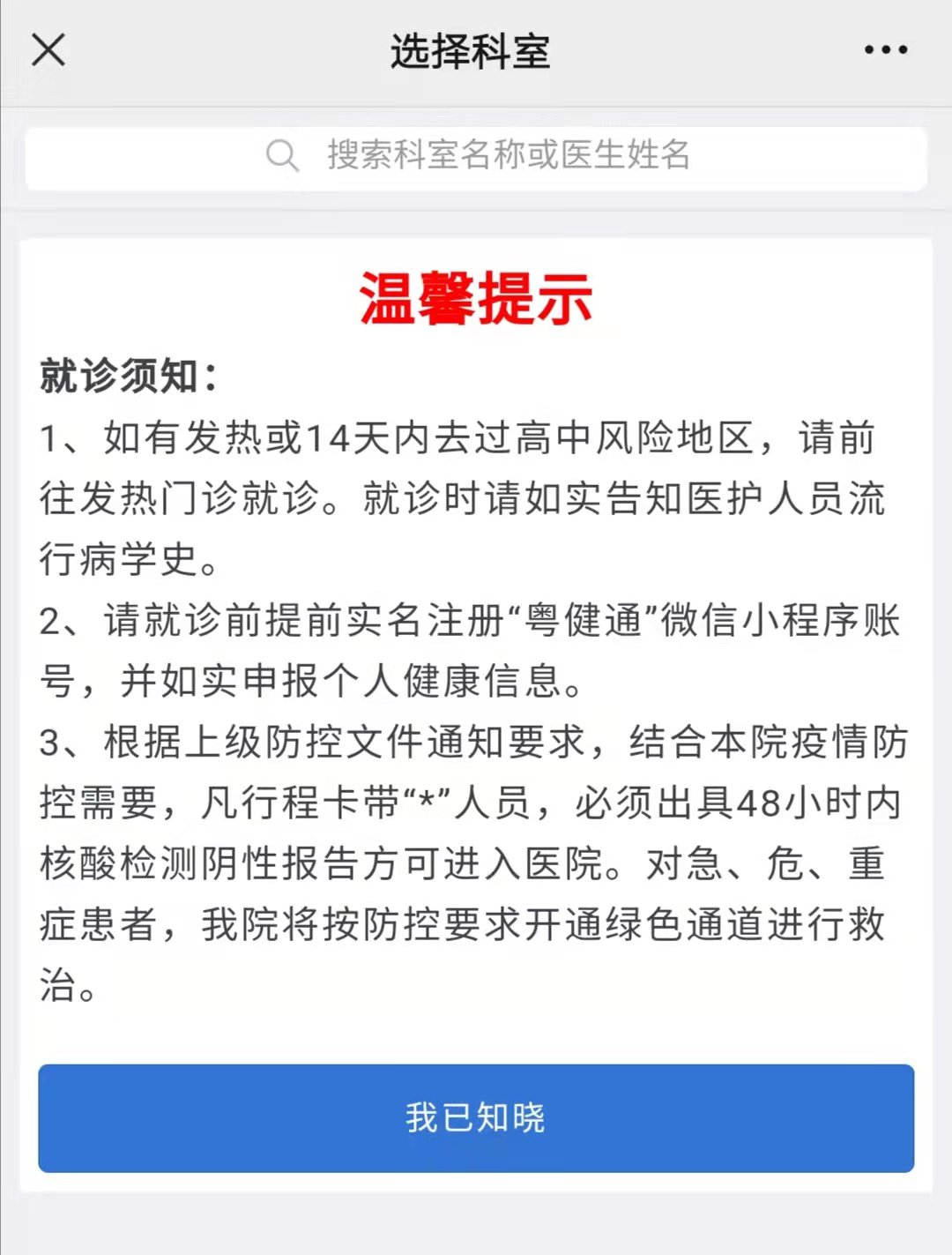 当您需要前往医院就医前,请主动登录“粤健通”微信小程序注册,并如实申报个人健康信息。预检分诊健康申报卡24小时有效。