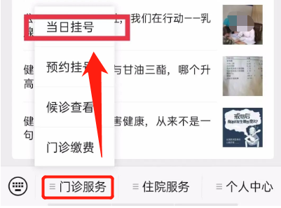 第二步:门诊服务→当日挂号,查看“温馨提示”;