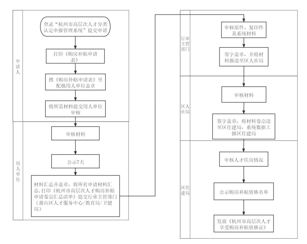 1.购房补贴资格申请。人才进入>>>“杭州市高层次人才分类认定申报管理系统”提交申请,经用人单位、行业主管部门、区人社局对申请人提交的申请材料进行审核后,将相关数据导入“杭州住房保障监管服务平台”系统,由区住建局进行住房情况核查。核发《杭州市高层次人才享受购房补贴资格证》。