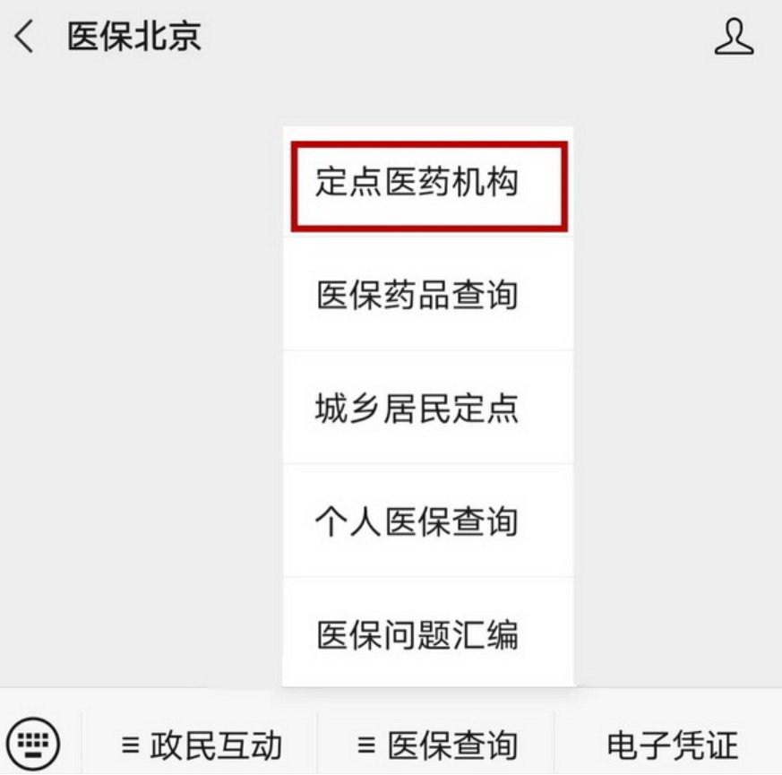 在【医保北京】微信公众号中点击【医保查询】,在项目列表中找到【定点医药机构】即可查询。