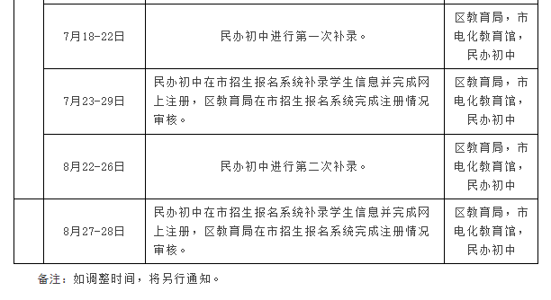未完成招生计划及注册报到后有缺口的民办学校,以自主招生的方式进行补录。民办学校可在微信公众号公布剩余学位,严格按免试入学的规定进行补录。拟补录名单报区教育局审核通过后正式录取。原则上符合本区录取条件的适龄儿童少年均可参加补录。
