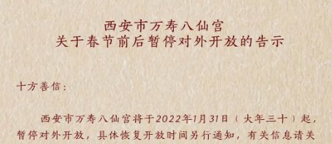 不开门,西安市万寿八仙宫将于2022年1月31日(大年三十)起,暂停对外开放,具体恢复开放时间另行通知