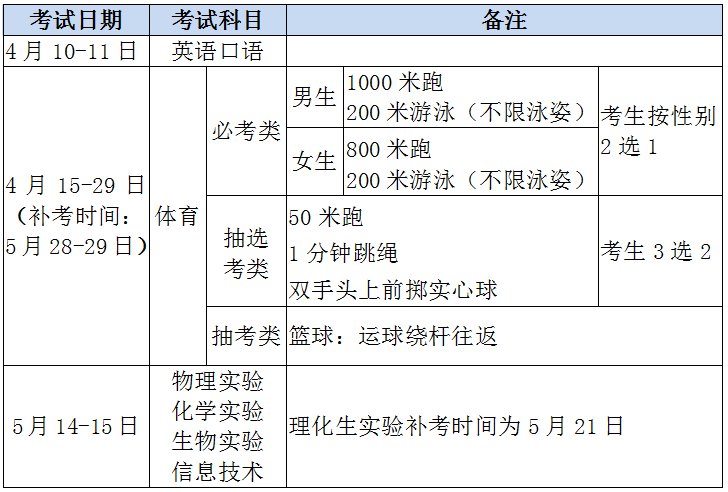 2.市级统一考试科目:体育与健康(身体素质与运动技能测试)、物理实验、化学实验、生物实验、信息技术、英语口语。
