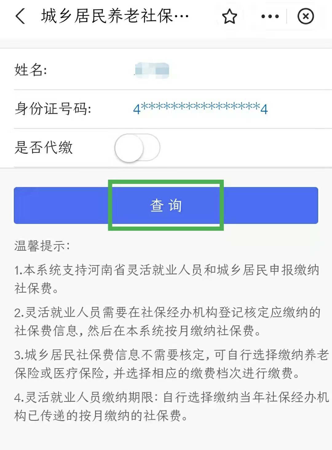 ⑥输入正确的身份信息,点击“查询”(点击“查询”前请认真核对缴费人姓名、证件号码,确定信息无误后,方可点击“查询”)