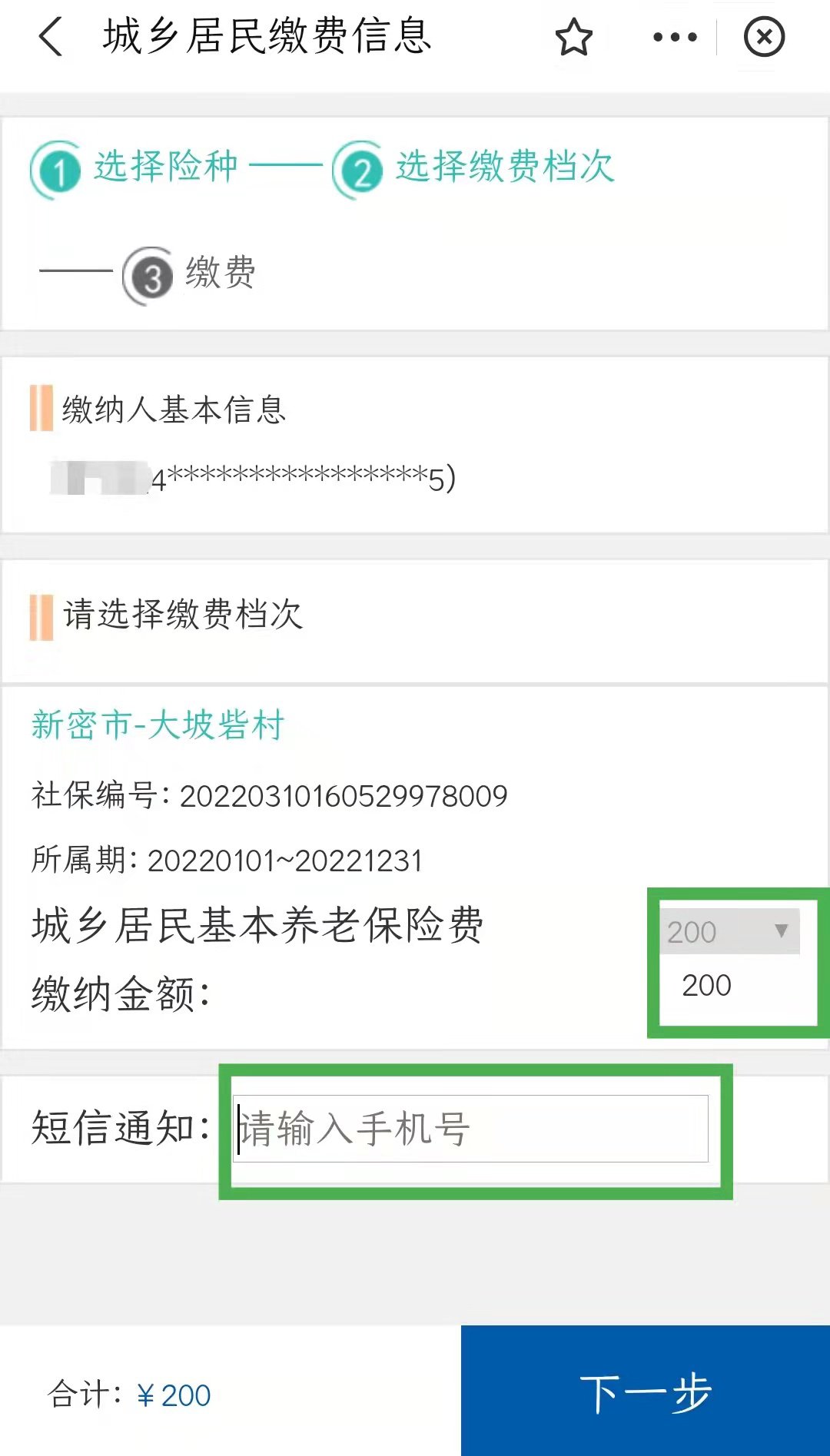 ⑧选择缴费档次,还需要填写接收短信通知的手机号码