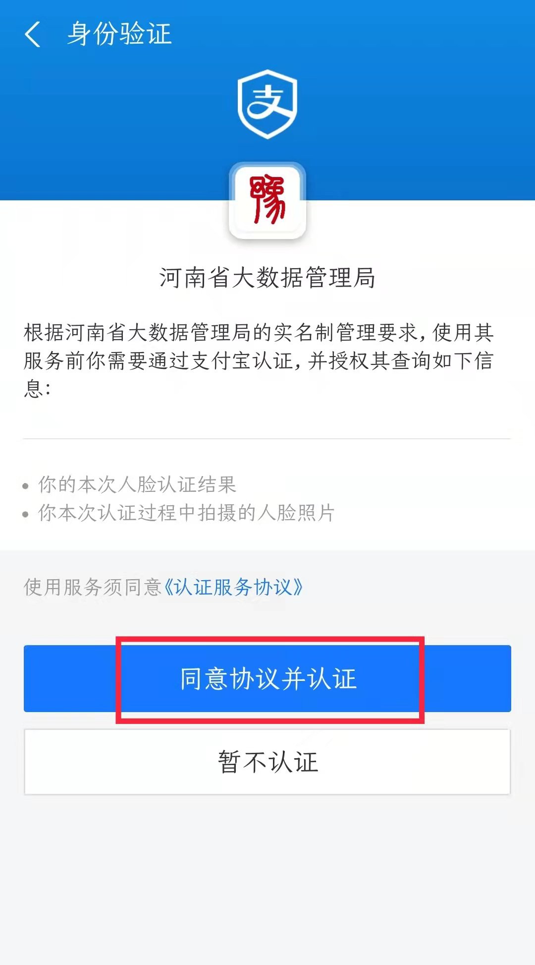 ④点击“同意协议并认证”,进行人脸识别认证