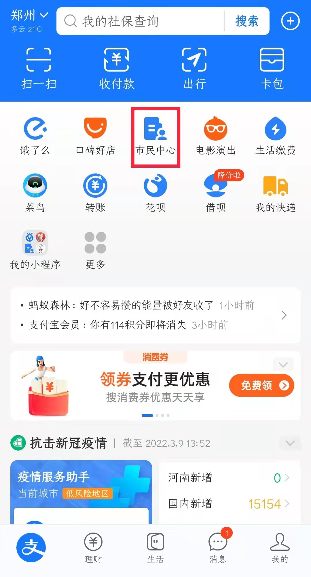 ①进入支付宝,点击“市民中心”