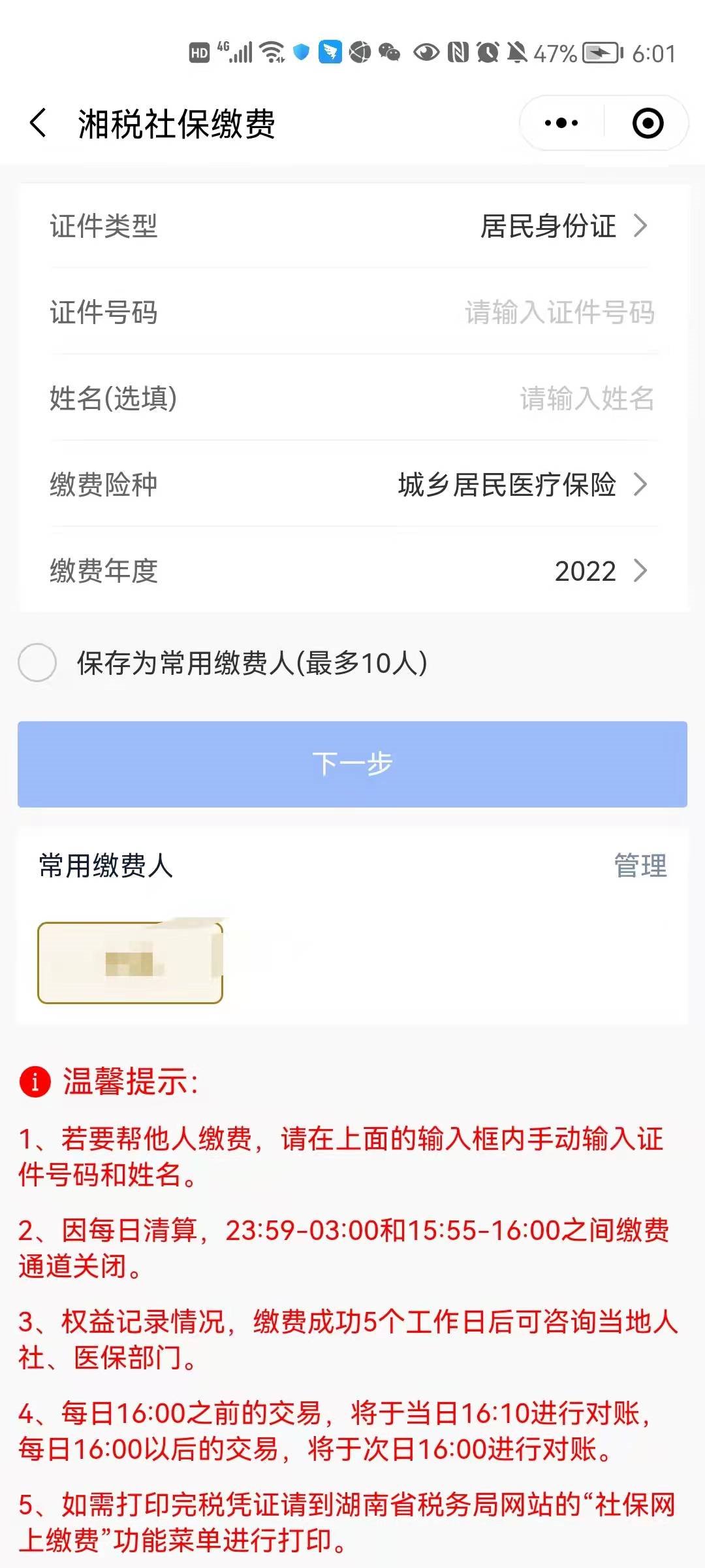 进入湘税社保APP或小程序,点击【城乡居民缴费】,输入相应人员的【证件号码】、【姓名】,选择城乡居民养老保险,相应缴费年度;点击【缴费】即可。