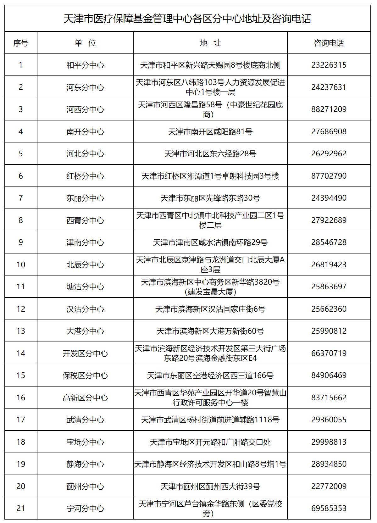 天津市医疗保障基金管理中心各区分中心地址及咨询电话: