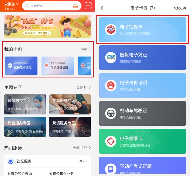 2. 注册登录“皖事通”,进入“我的卡包”专区,申领“电子社保卡”后点击进入。