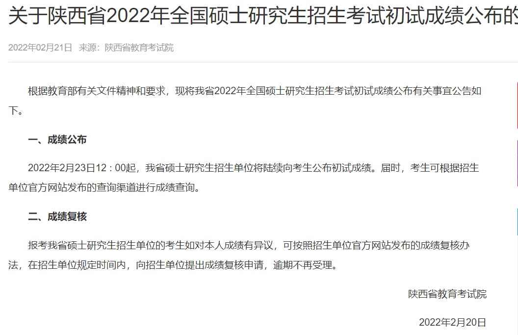 关于陕西省2022年全国硕士研究生招生考试初试成绩公布的公告