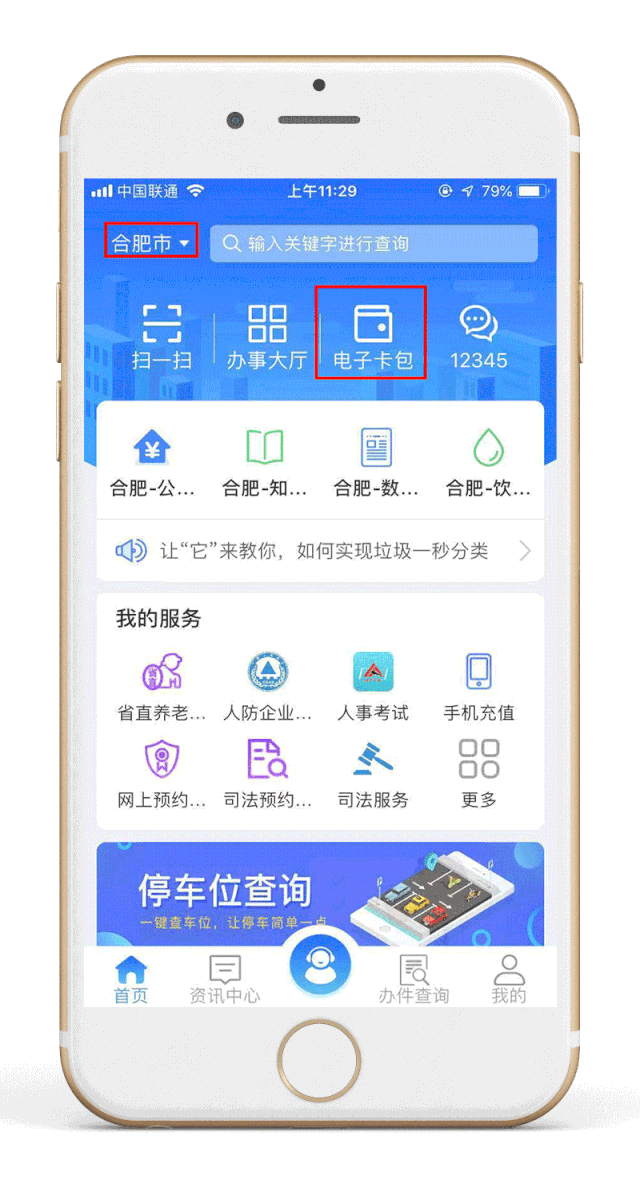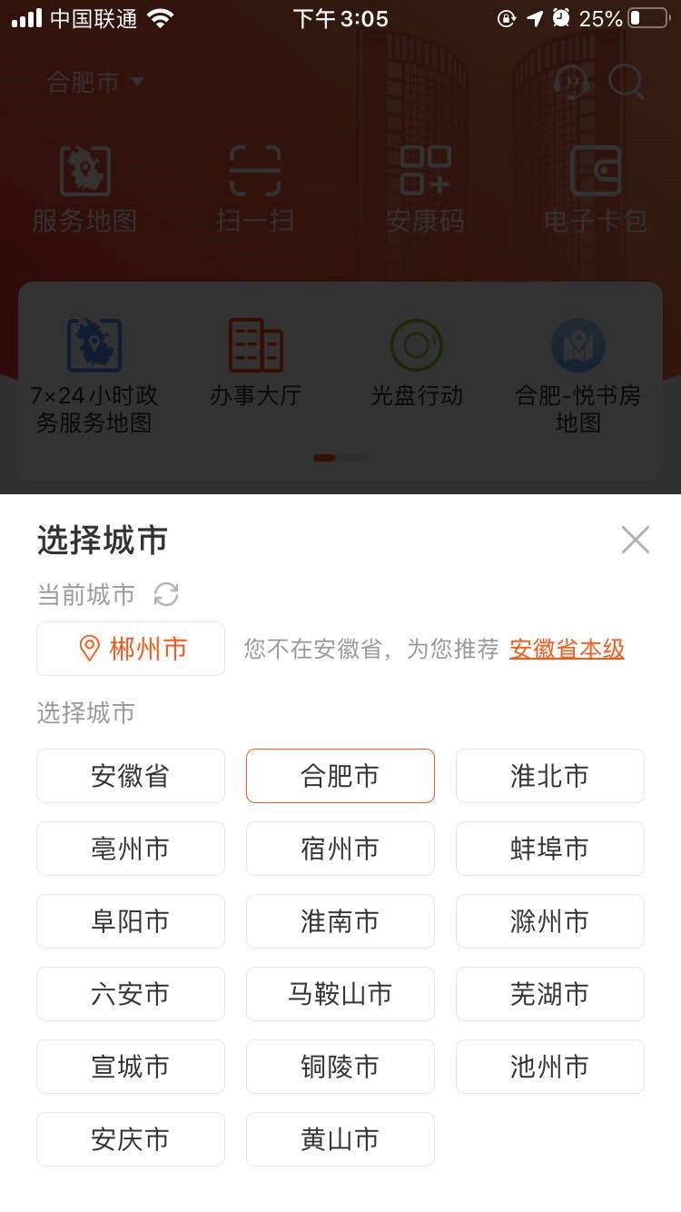 step2:进入“皖事通”首页,选择地区“合肥市”。