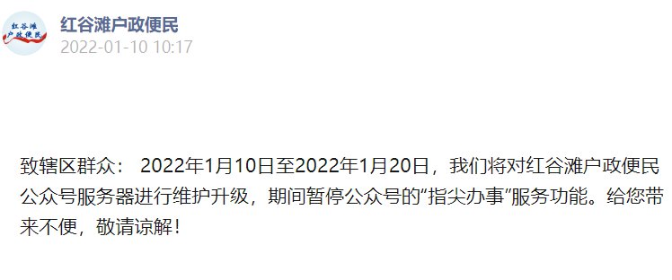 2022年1月10日至2022年1月20日,我们将对红谷滩户政便民公众号服务器进行维护升级,期间暂停公众号的“指尖办事”服务功能。给您带来不便,敬请谅解!