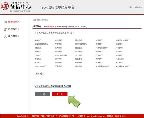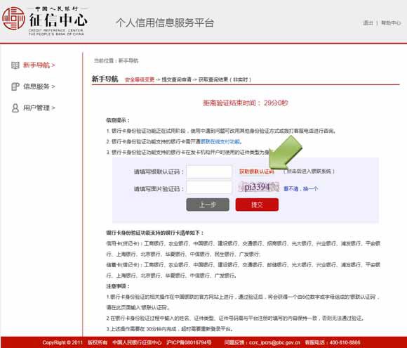 提交查询申请后的24小时后,用户登录平台,点击"信息服务"—"获取查询结果",输入平台发送到用户手机上的身份验证码,查看选择的信用信息产品。
