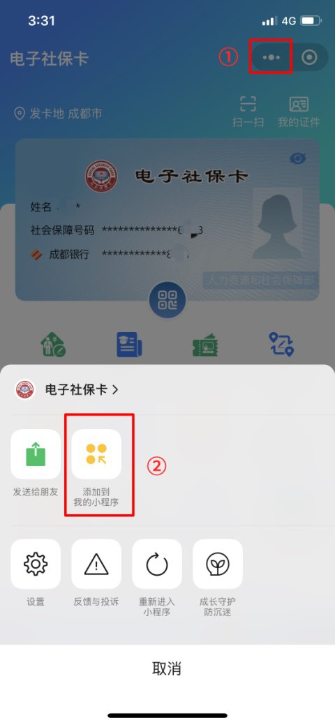 (3)那么怎么将电子社保卡小程序放至桌面呢?点击电子社保卡主界面右上角“...”,选择添加到桌面后即可一键点开电子社保卡页面。(也可以选“添加到我的小程序”里哦)